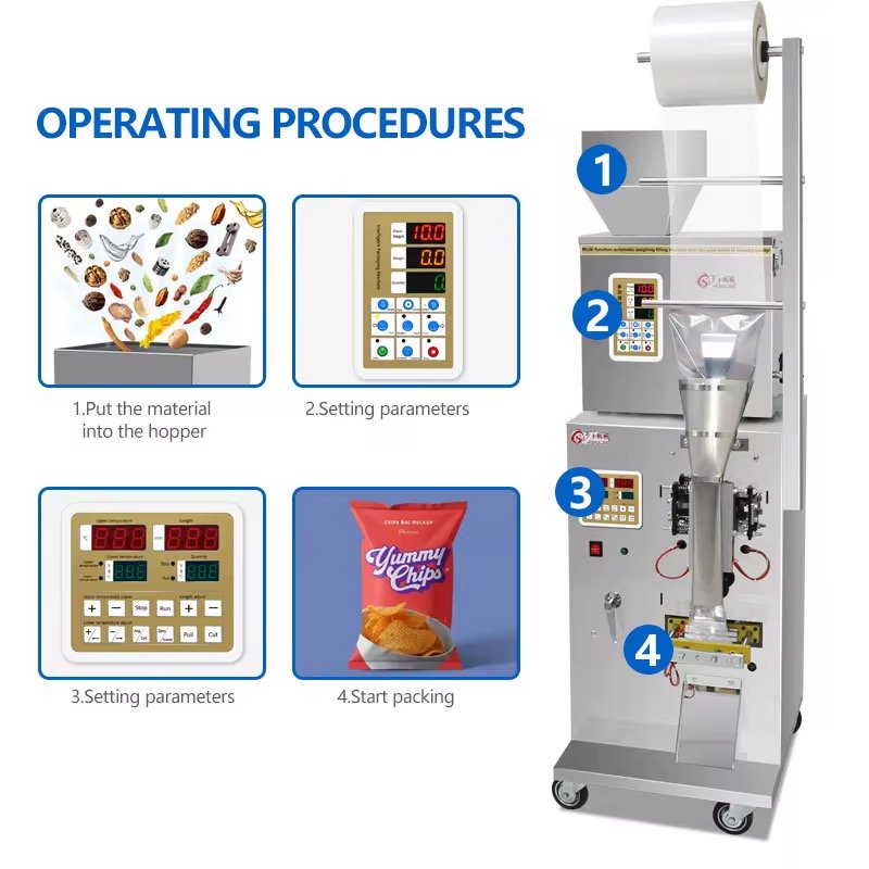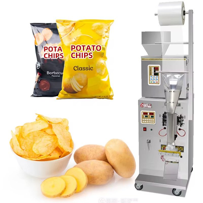 Machine automatique d’emballage des Chips, remplissage automatique, pesage automatique, emballage automatique, comptage automatique, nettoyage en un clic, étanchéité automatique du sac. Plage de poids 1-100g (peut être personnalisé), vitesse 5-18/min selon le matériel, longueur du sac 3-20 cm